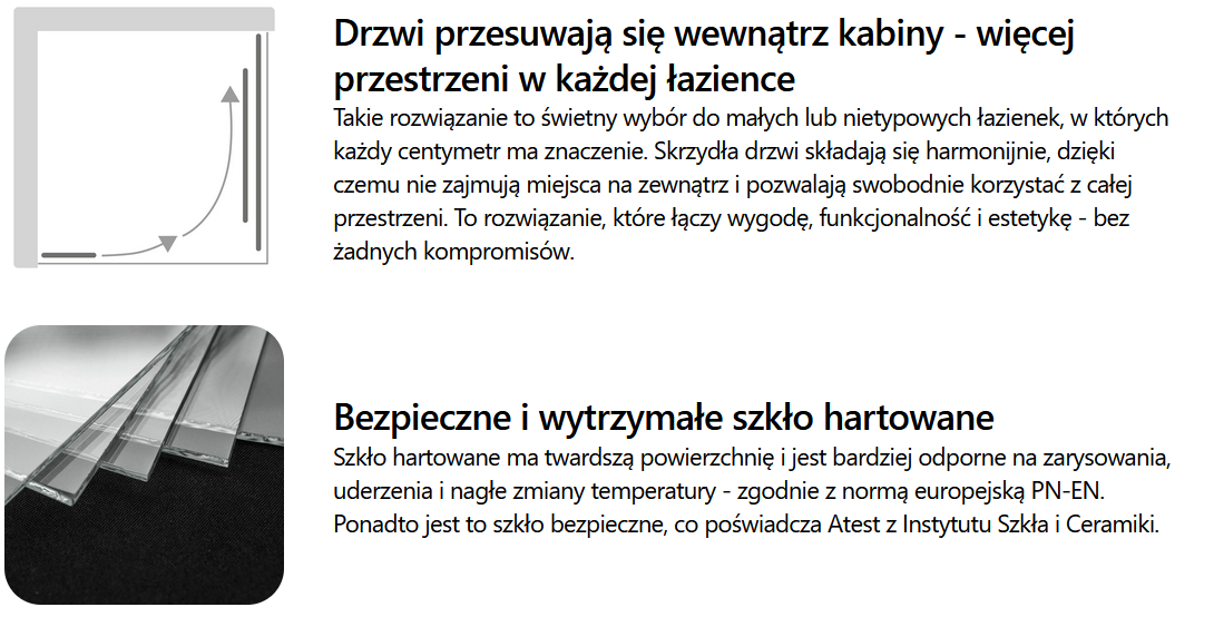 • Drzwi przesuwają się wewnątrz kabiny - więcej przestrzeni w każdej łazience
