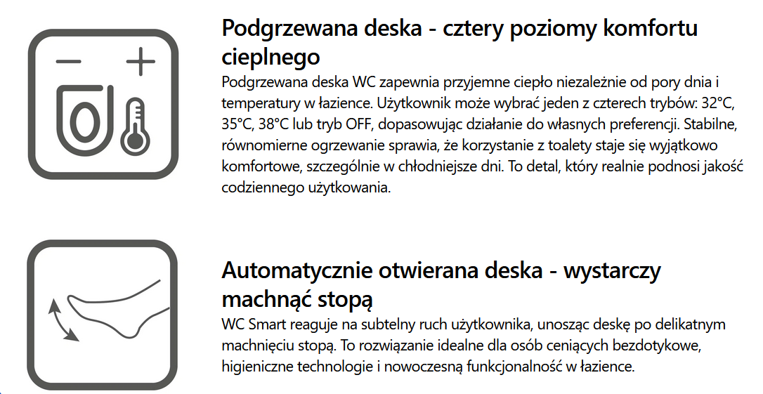 WC Smart basic to miska WC zaprojektowana z myślą o maksymalnej higienie i komforcie codziennego użytkowania. Dzięki wbudowanemu sensorowi wykrywania użytkownika deska unosi się automatycznie w momencie podejścia, zapewniając pełną higienę i komfort bez dotykania jakichkolwiek elementów. Dodatkowo miska wyposażona jest w podgrzewaną deskę, która gwarantuje przyjemne ciepło podczas użytkowania. Regulowana temperatura sprawia, że korzystanie z toalety jest komfortowe o każdej porze dnia, szczególnie w chłodniejsze miesiące. Aby dopasować wygląd WC Smart do stylu wnętrza, w zestawie znajdują się dwa panele maskujące: w kolorze białym oraz grafitowym. Pozwala to idealnie zintegrować urządzenie z aranżacją łazienki. WC Smart basic to połączenie higieny, wygody i nowoczesnego wzornictwa — rozwiązanie, które realnie podnosi standard codziennego korzystania z toalety.