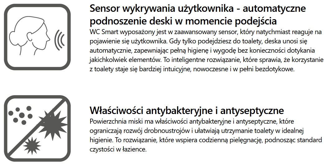 - Sensor wykrywania użytkownika - automatyczne podnoszenie deski w momencie podejścia