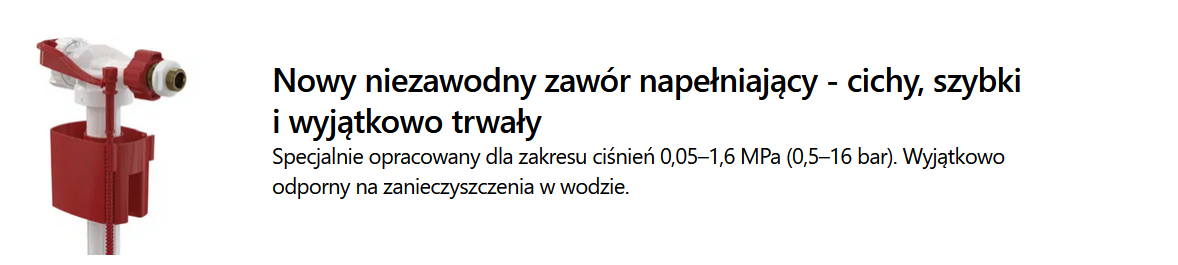 • Cicha praca: Nowoczesny, niezawodny zawór napełniający pracuje wyjątkowo cicho, co znacząco podnosi komfort korzystania z łazienki.