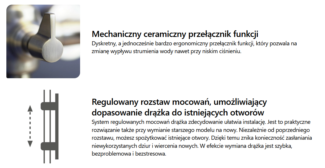 - Regulowany rozstaw mocowań, umożliwiający dopasowanie drążka do istniejących otworów