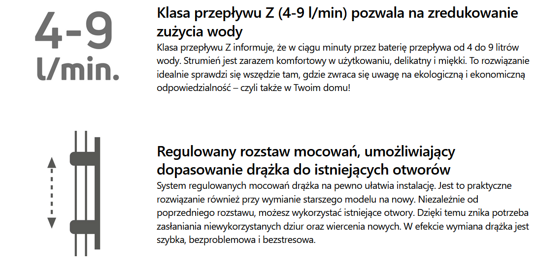 - Klasa przepływu Z (4-9 l/min) pozwala na zredukowanie zużycia wody