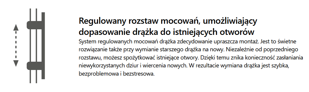 • Regulowany rozstaw mocowań, umożliwiający dopasowanie drążka do istniejących otworów